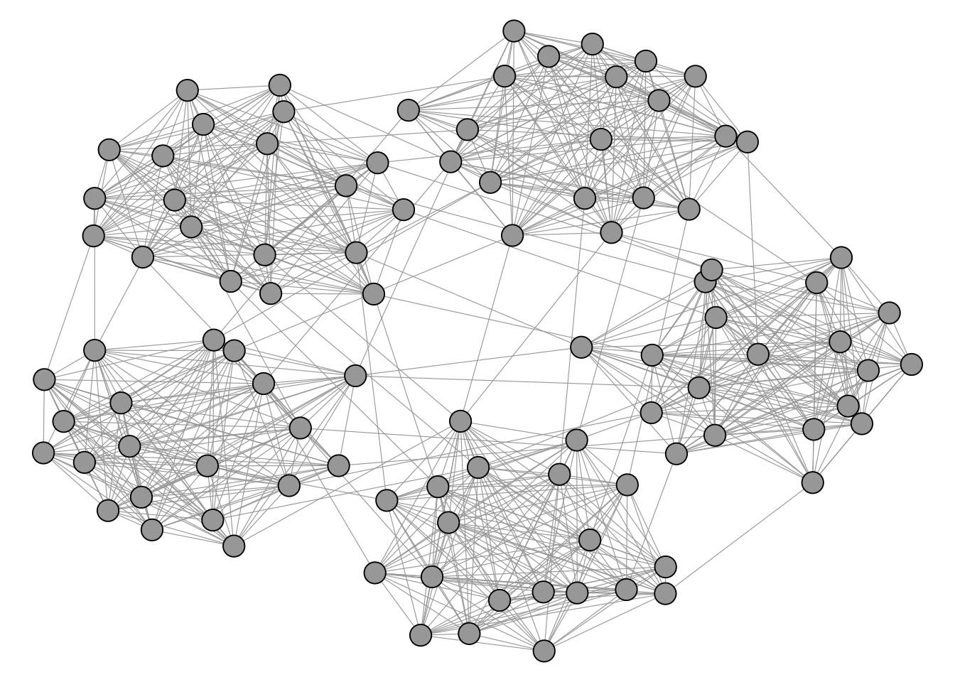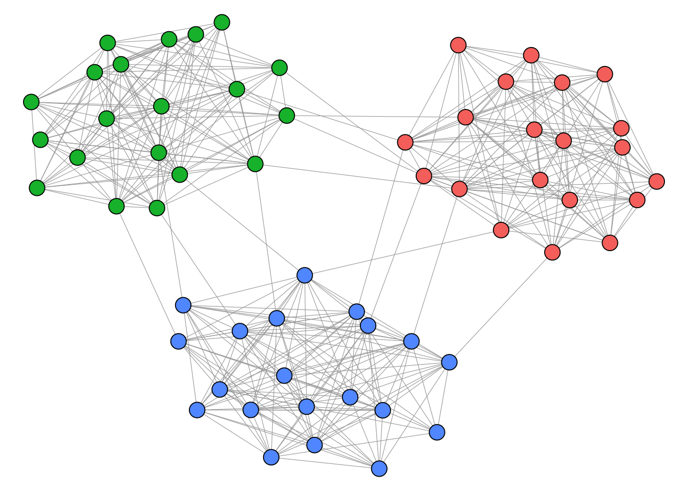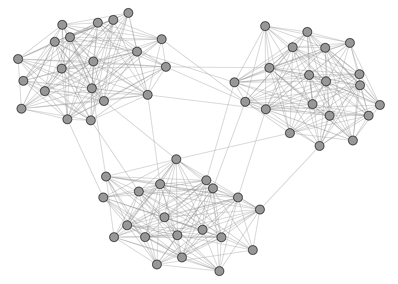 Unlike cliques, which have a precise mathematical definition, the notion of a “community” or “cluster” in a network is inherently fuzzy. The general intuition, however, is straightforward: a community is a group of nodes that are more densely connected to each other than to the rest of the network. But there is no universally accepted formal definition of what this actually means. How dense is dense enough? How sparse must the connections to outsiders be? Different algorithms operationalise this intuition in different ways, which is why they can produce different results on the same network. This is not a flaw but a reflection of the fact that “community” is a flexible concept whose meaning depends on the context of the analysis.