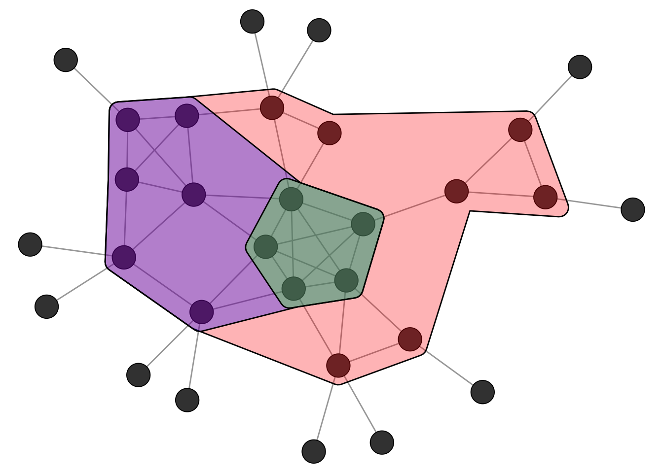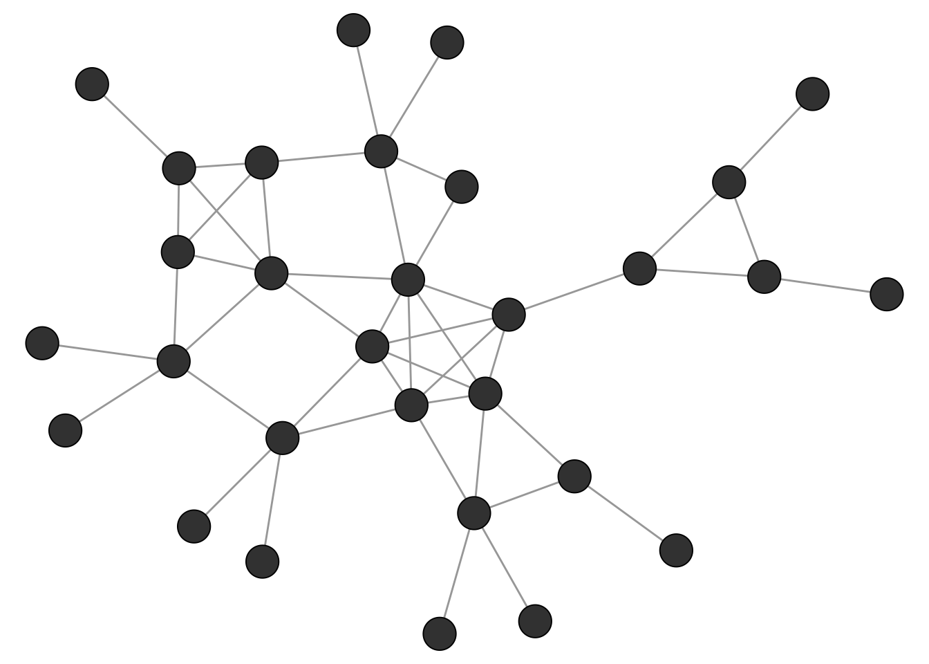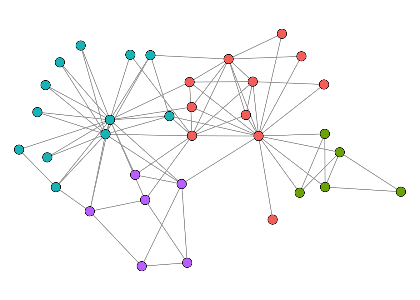 Unlike cliques, which have a precise mathematical definition, the notion of a “community” or “cluster” in a network is inherently fuzzy. The general intuition, however, is straightforward: a community is a group of nodes that are more densely connected to each other than to the rest of the network. But there is no universally accepted formal definition of what this actually means. How dense is dense enough? How sparse must the connections to outsiders be? Different algorithms operationalise this intuition in different ways, which is why they can produce different results on the same network. This is not a flaw but a reflection of the fact that “community” is a flexible concept whose meaning depends on the context of the analysis.
