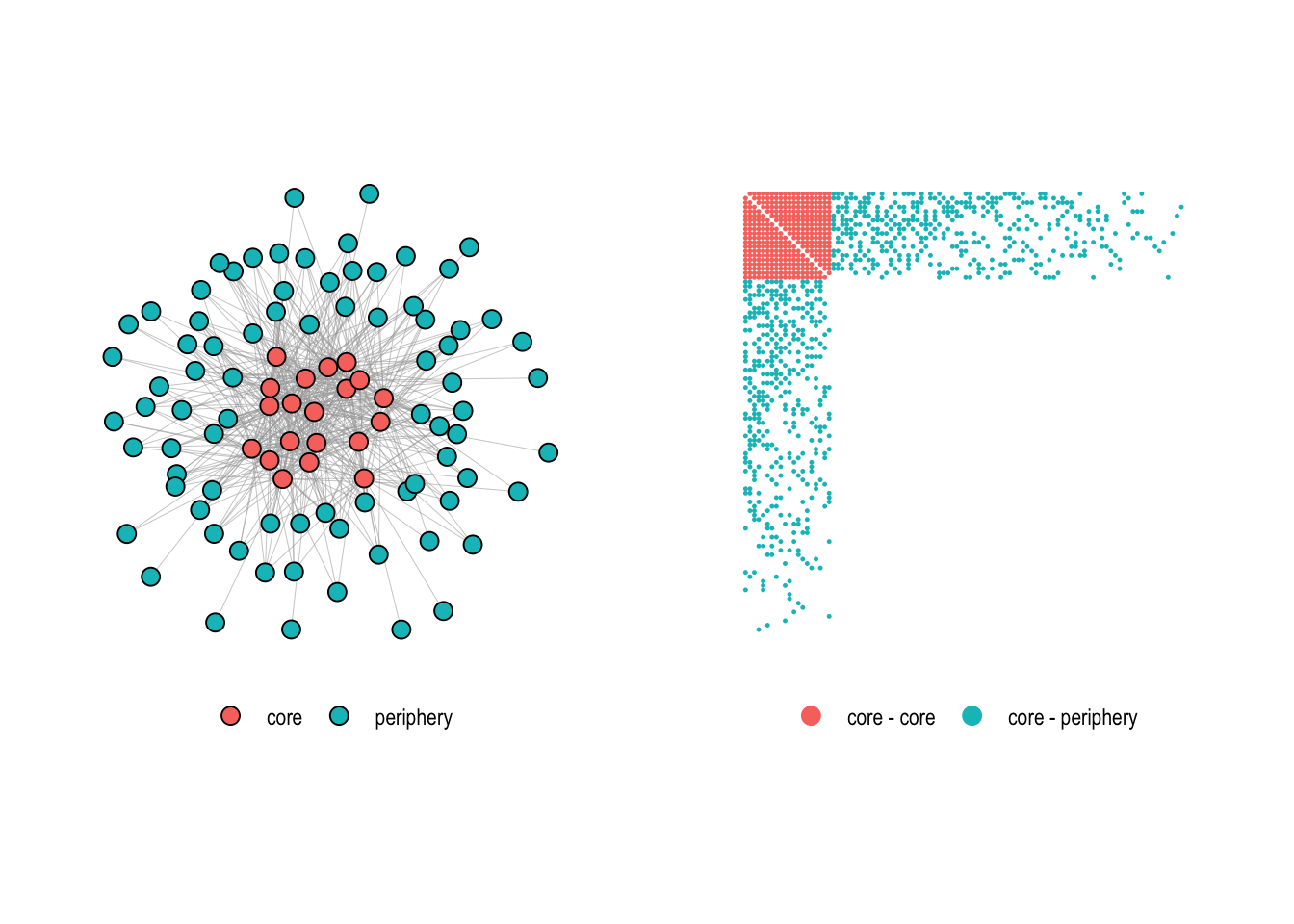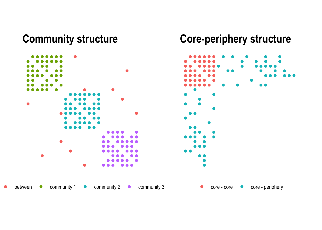 The difference between the two concepts becomes clear when looking at the adjacency matrix. In a community structure, dense blocks appear along the diagonal, each corresponding to a tightly connected group (Figure 5.12, left). In a core-periphery structure, a single dense block sits in one corner of the matrix, representing the core, while the rest remains sparse (Figure 5.12, right).