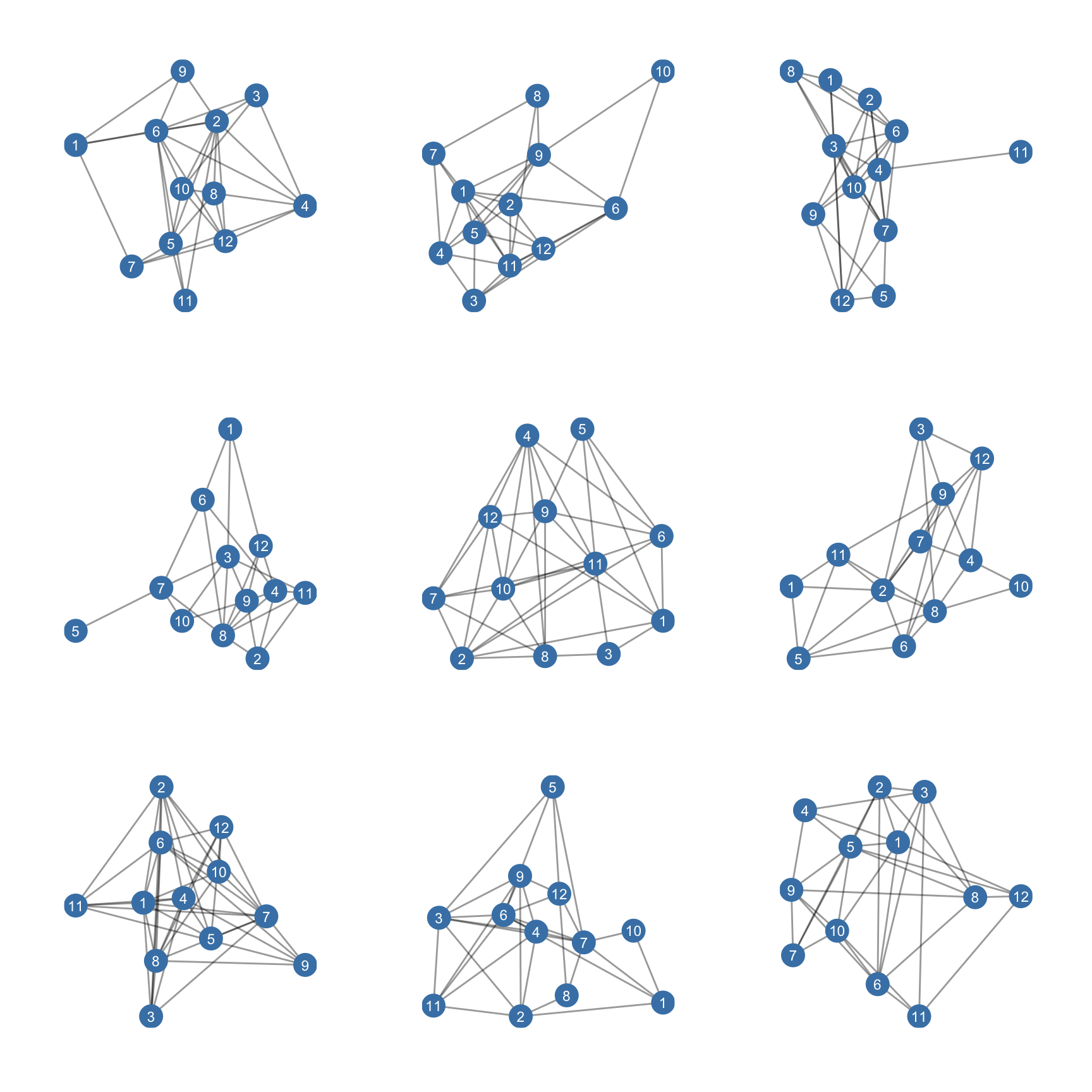We now visualize a subset of the data by plotting the first 9 ego networks in the list using ggraph. This is shown in Figure 8.1.