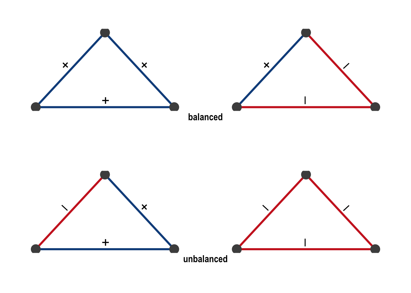 More formally, a triangle is balanced if it has an even number of negative ties (zero or two), and unbalanced if it has an odd number (one or three). All four possible configurations are shown in Figure 7.3.