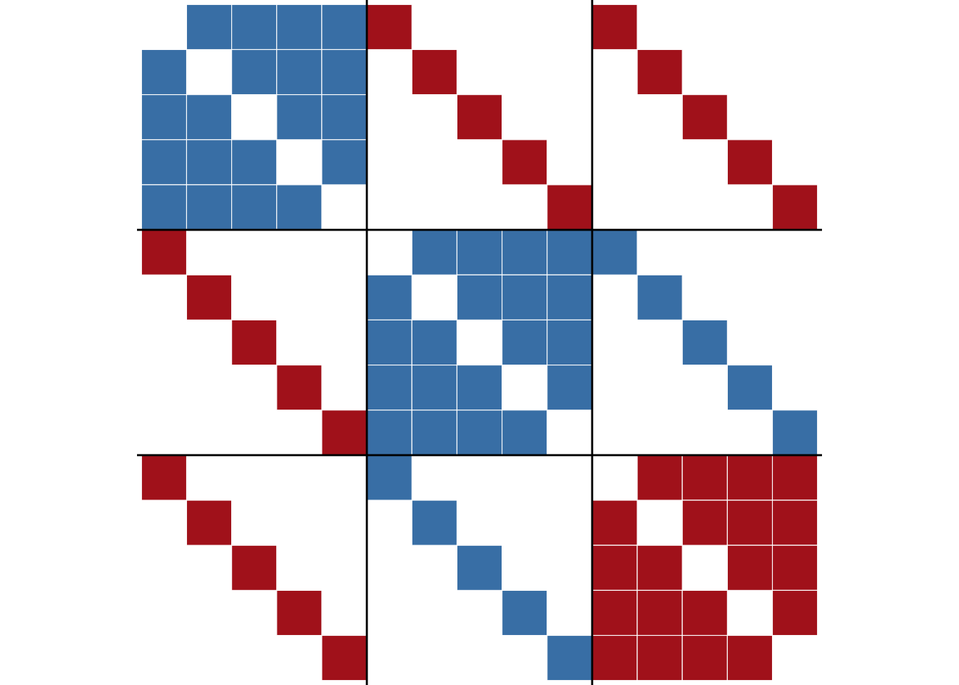 The traditional blockmodeling assumes a single pattern of positive blocks on the diagonal and negative blocks off the diagonal. But many networks have more complex structures (Doreian and Mrvar 2009). For instance, two groups might be allies (positive ties between them) while both are enemies of a third group.