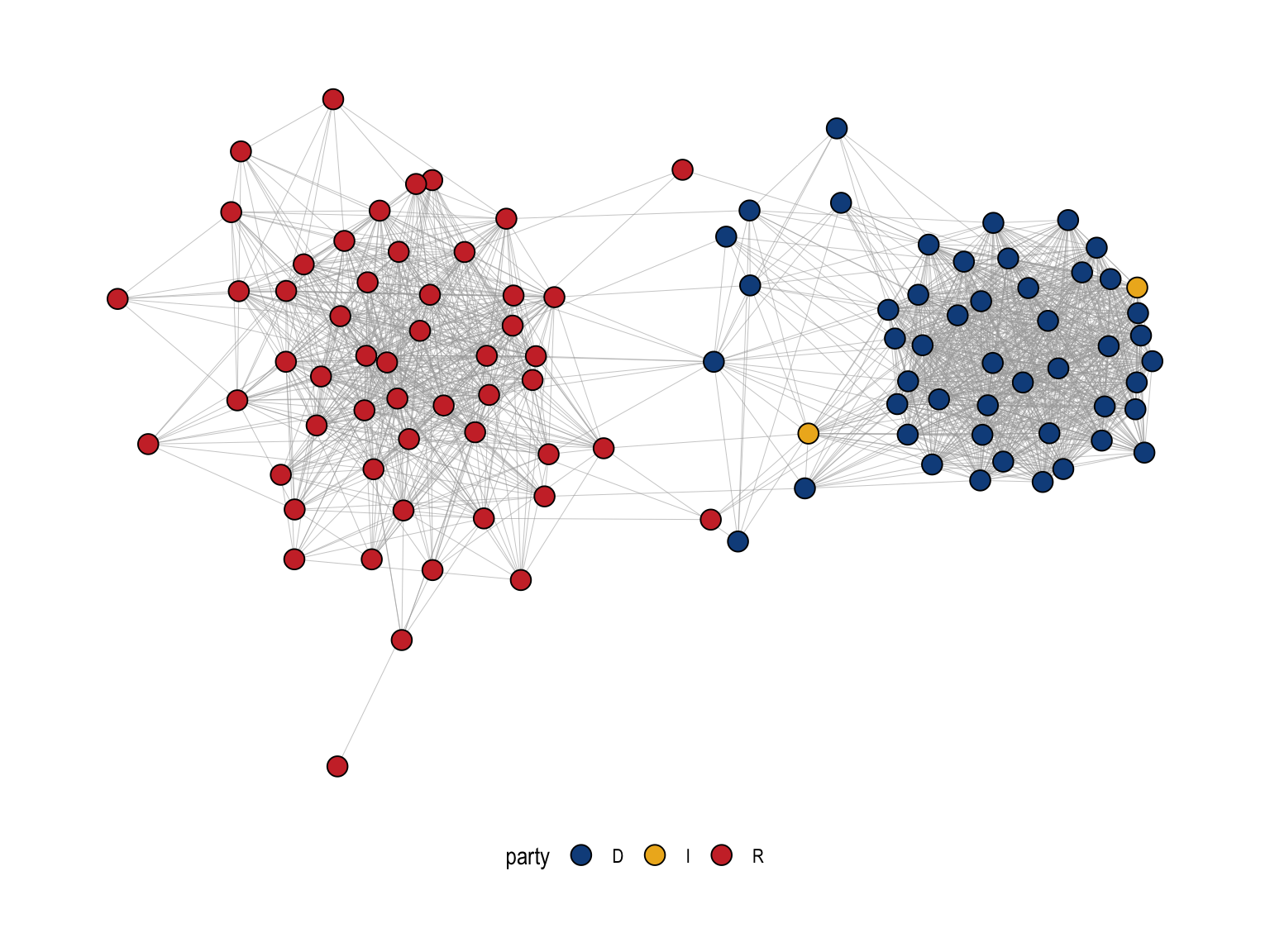 In contrast, there are only a small number of edges spanning the gap between the two clusters. These cross-party ties represent relatively rare cases of unusually strong bipartisan cosponsorship. Senators positioned near the boundary between the clusters, and the few cross-cluster edges attached to them, can be interpreted as potential “broker-like” actors in this backbone, in the sense that they are among the limited set of senators whose cosponsorship patterns connect the two partisan blocs. The Independent senators (yellow) appear closer to one side but near the interface, consistent with the idea that independents often align with one coalition while occasionally participating in cross-party collaborations. Overall, the figure shows that once we filter the projection to retain only statistically meaningful ties, cosponsorship is dominated by within-party collaboration, with comparatively little bipartisan structure.