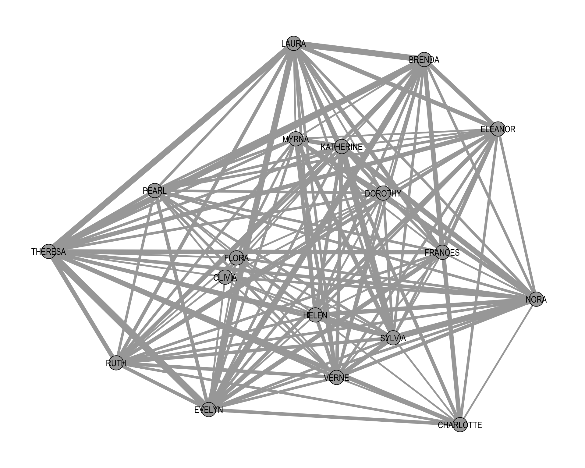 Figure 6.3 visualizes the weighted women–women projection. The edge widths are scaled according to the number of shared events, so thicker edges indicate pairs of women who attended more events together.