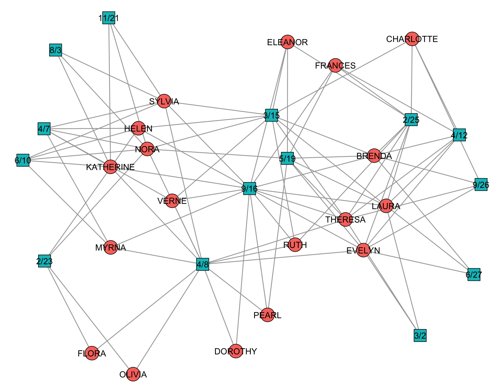 To illustrate methods tailored for two-mode networks, we will use the well-known Southern Women dataset (Davis et al. 2009). This classic dataset records the attendance patterns of 18 women at 14 social events in the American South, and has become a foundational example in network analysis. The network is included in the networkdata package and provides a canonical example of an affiliation (incidence) matrix suitable for demonstrating two-mode network methods and one-mode projections.