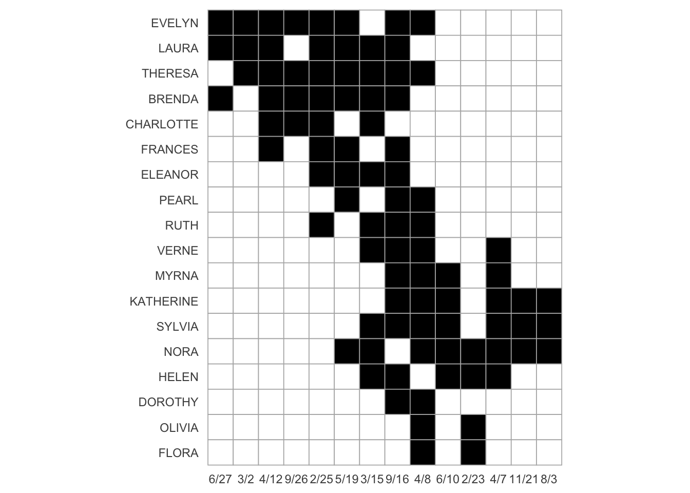 To illustrate methods tailored for two-mode networks, we will use the well-known Southern Women dataset (Davis, Gardner, and Gardner 2009). This classic dataset records the attendance patterns of 18 women at 14 social events in the American South, and has become a foundational example in network analysis. The network is included in the networkdata package and provides a canonical example of an affiliation (incidence) matrix suitable for demonstrating two-mode network methods and one-mode projections. The biadjacency matrix and can be obtained via as_biadjacency_matrix(). This matrix is visualized in Figure 6.1.