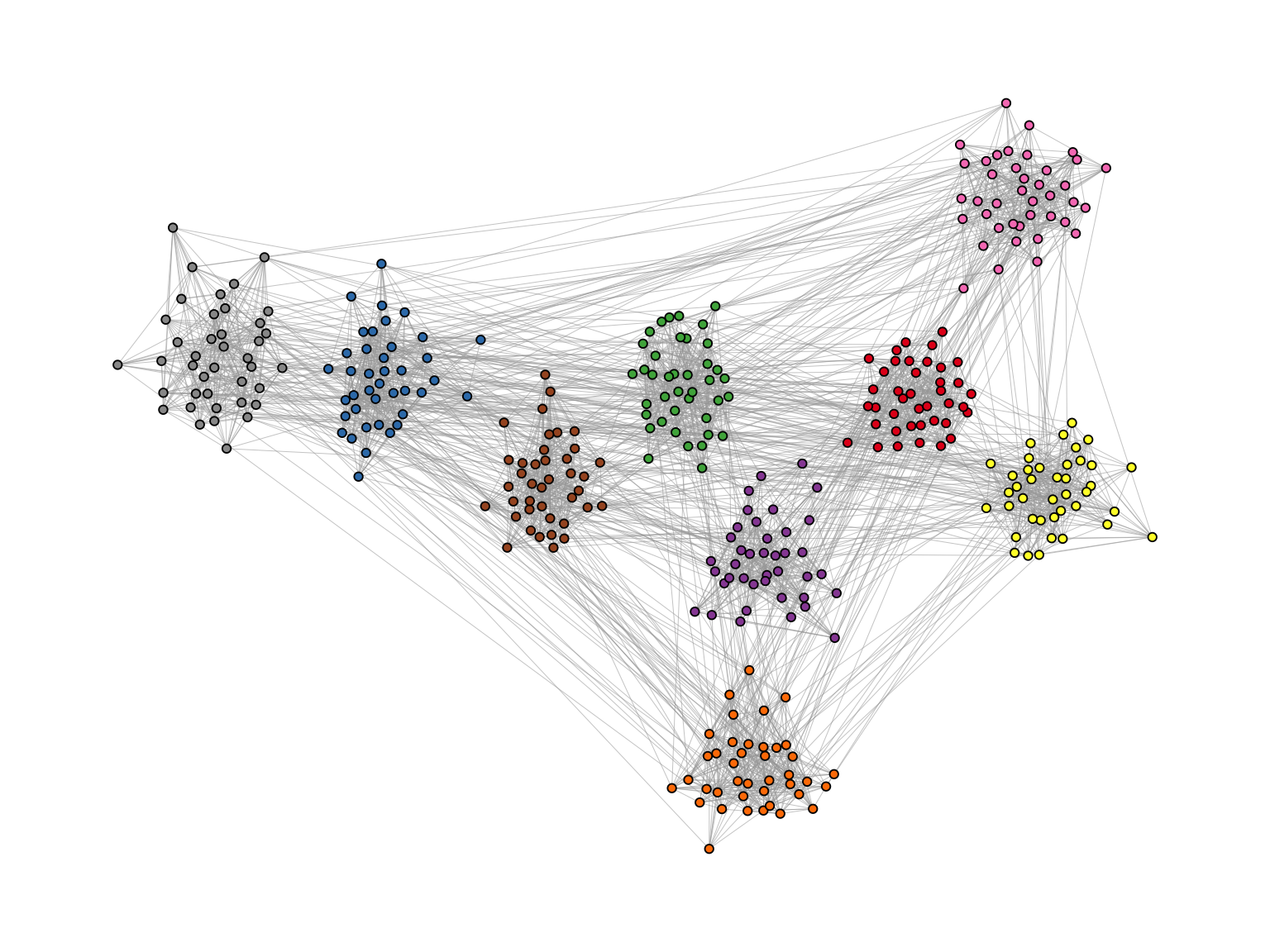 The idea of the algorithm is as follows. For each edge, an embeddedness score is calculated which serves as an edge weight attribute. These weights are then ordered and only the edges with the highest score are kept. The number of edges to keep is controlled with the keep parameter. In our example below, we keep the top 40%. The parameter usually requires some experimenting to find out what works best. The resulting network is the “backbone” of the original network and the stress layout algorithm is applied to this network. Once the layout is calculated, all edges are added back to the network. Figure 11.7 shows the network with the backbone layout. The group structure is now clearly visible, even though the same number of edges are shown as in the previous plot.