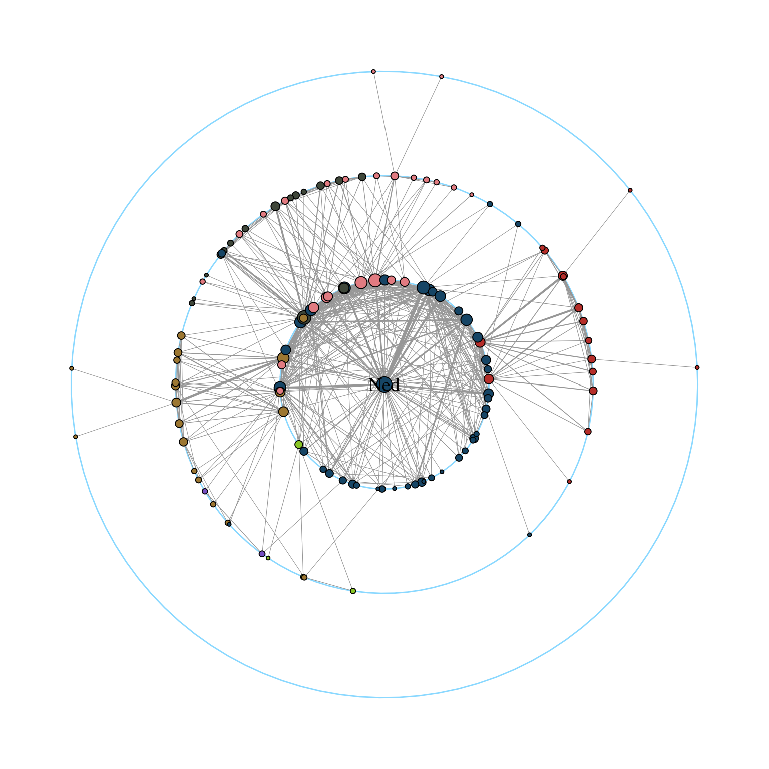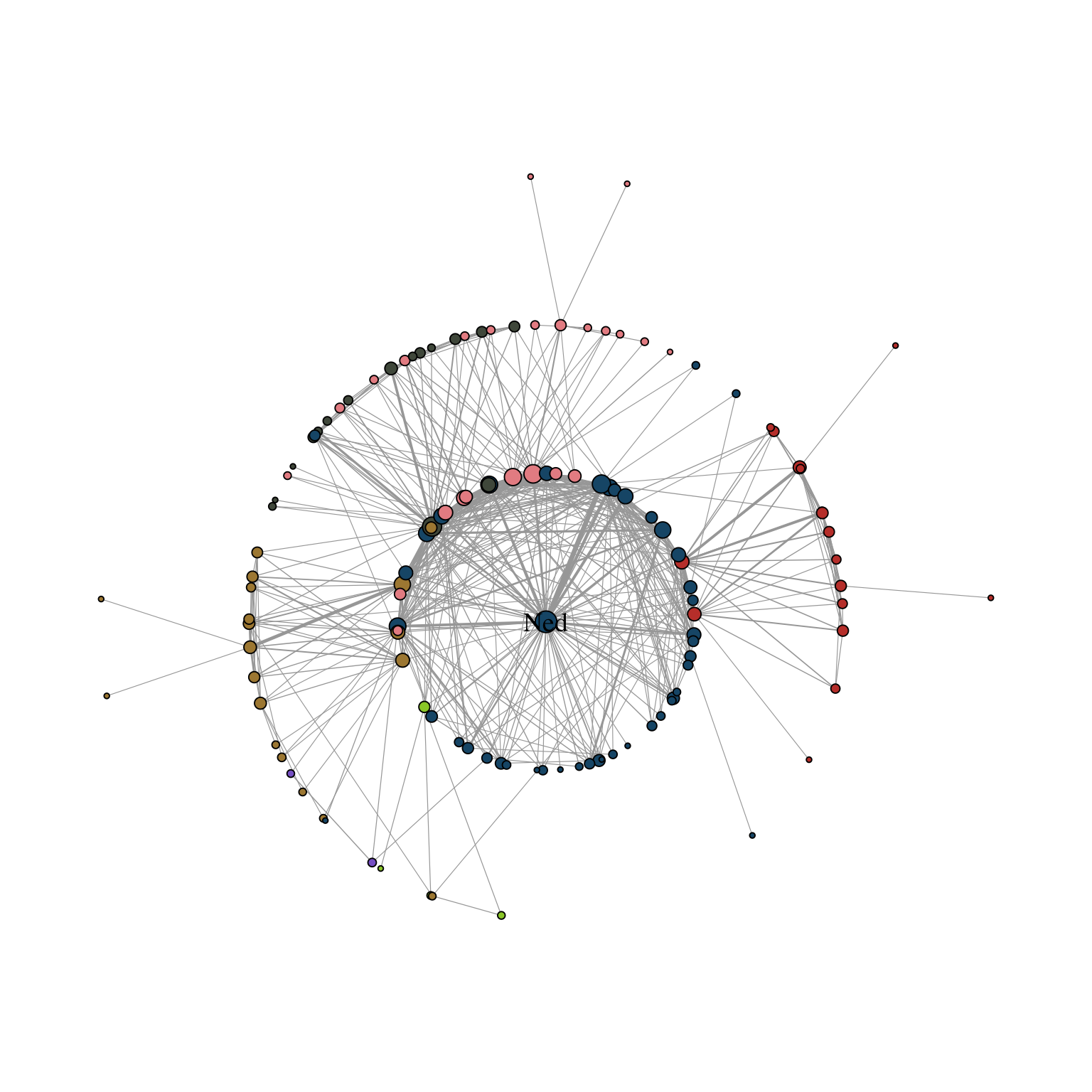 The first one allows to focus the network on a specific node and arrange all other nodes in concentric circles (depending on the geodesic distance). In Figure 11.3, we focus the layout around the character Ned Stark.