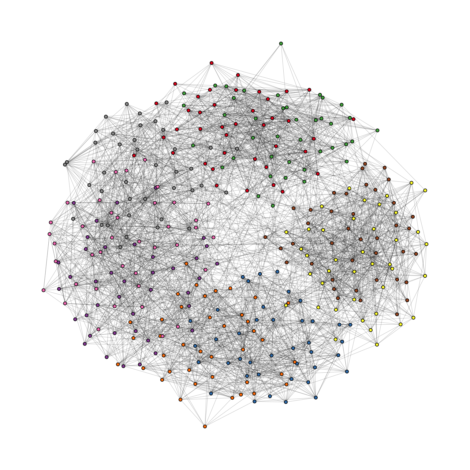 Evidently, the graph seems to be a proper “hairball” without any special structural features standing out. In this case, however, we know that there should be 9 groups of vertices that are internally more densely connected than externally. To uncover this group structure, we turn to the “backbone layout”.