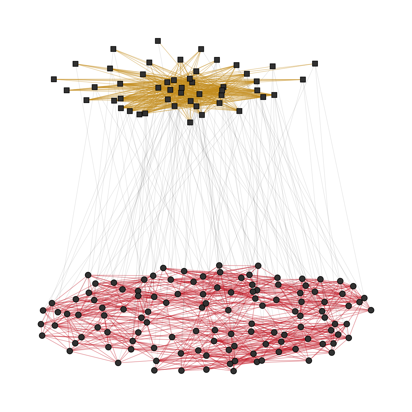 To use this layout option, set type = "separate" and specify two layout functions with FUN1 and FUN2. You can change internal parameters of these layout functions with named lists in the params1 and params2 argument. Note that this version optimizes inter-level edges only minimally. The emphasis is on the intra-level structures.