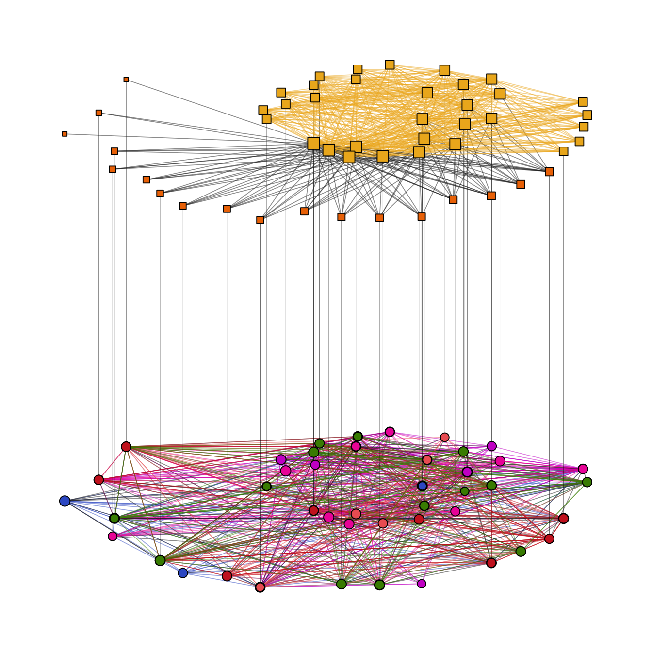 A layout for the complete network can be computed via layout_as_multilevel() setting type = "all". Internally, the algorithm produces a constrained 3D stress layout (each level on a different y plane) which is then projected to 2D. This layout ignores potential differences in each level and optimizes only the overall layout.