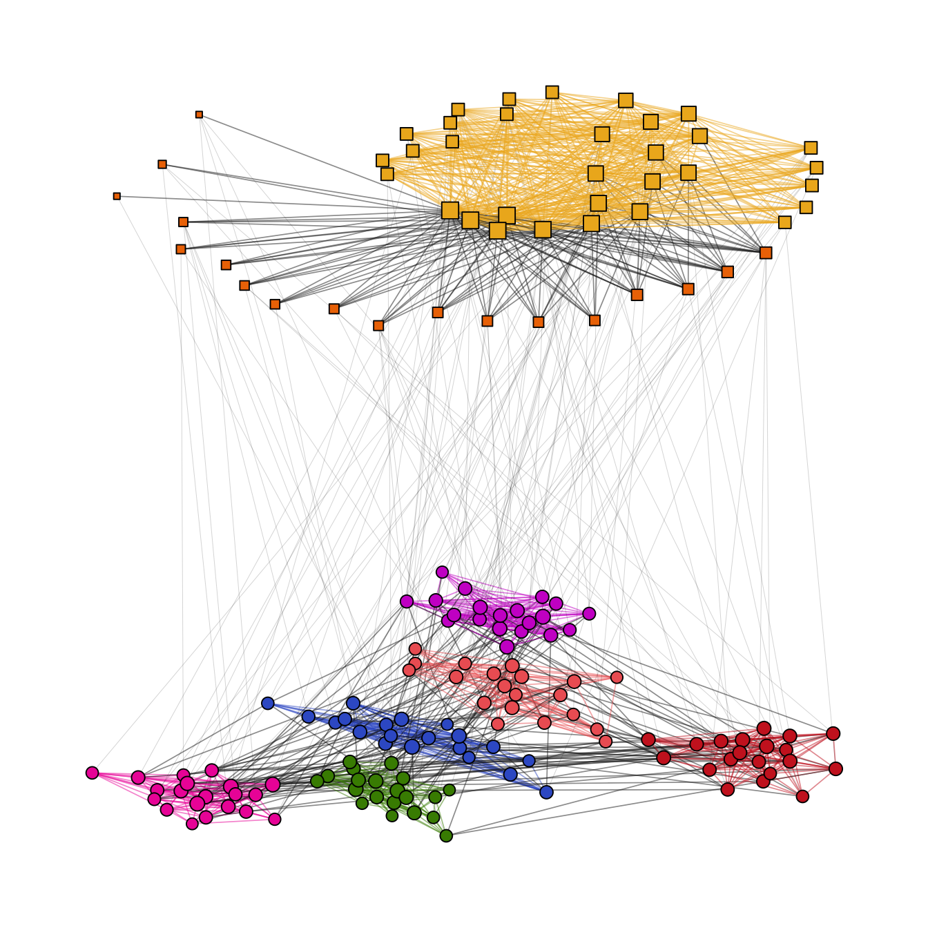 In many instances, there may be different structural properties inherent to the levels of the network. In that case, two layout functions can be passed to layout_as_multilevel() to deal with these differences. In our artificial network, level 1 has a hidden group structure and level 2 has a core-periphery structure.