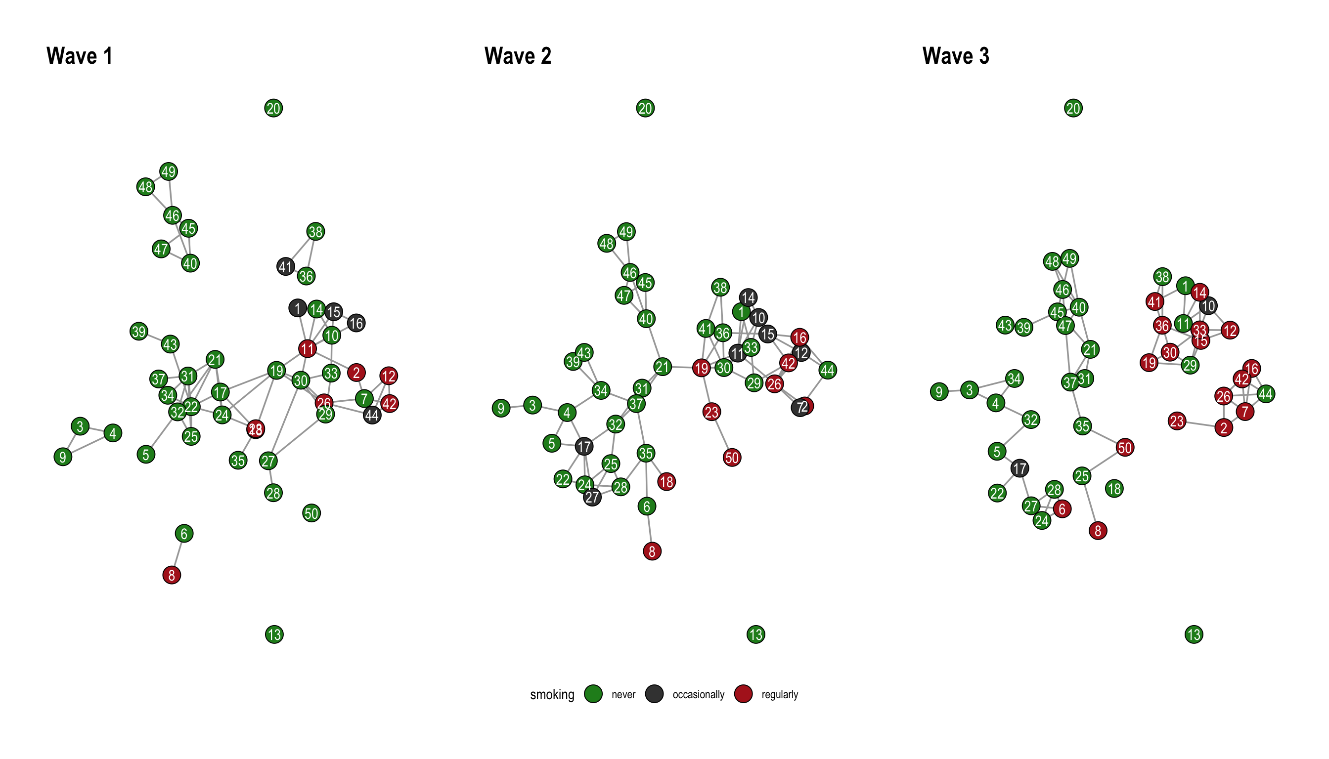 data("s50")The dataset consists of three networks with 50 student together with their smoking behavior as a node attribute. The function layout_as_dynamic() from graphlayouts can be used to visualize the three networks. The implemented algorithm calculates a reference layout which is a layout of the union of all networks and individual layouts based on stress minimization and combines those in a linear combination which is controlled by the alpha parameter. For alpha = 1, only the reference layout is used and all graphs have the same layout. For alpha=0, the stress layout of each individual graph is used. Values in-between interpolate between the two layouts. The algorithm is not directly usable with ggraph, so we need to calculate the layout separately and then use the resulting coordinates in ggraph with the “manual” layout.