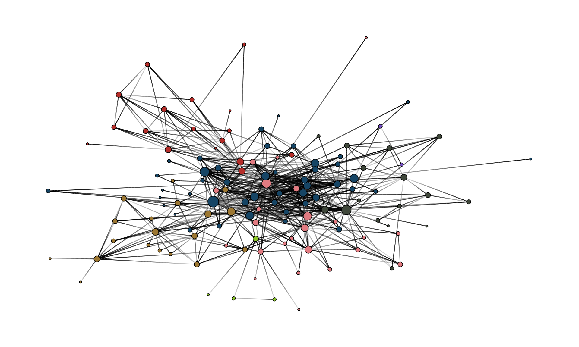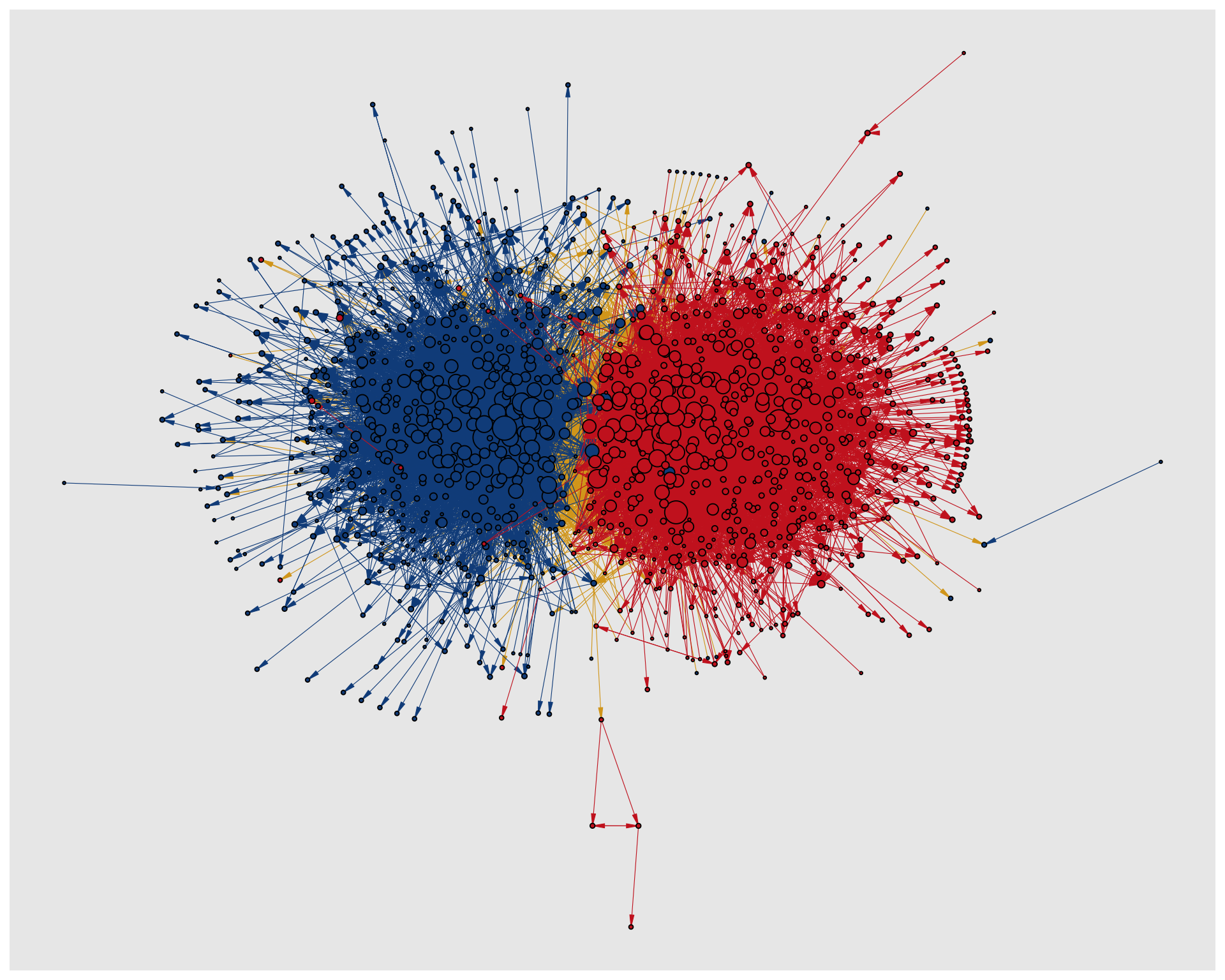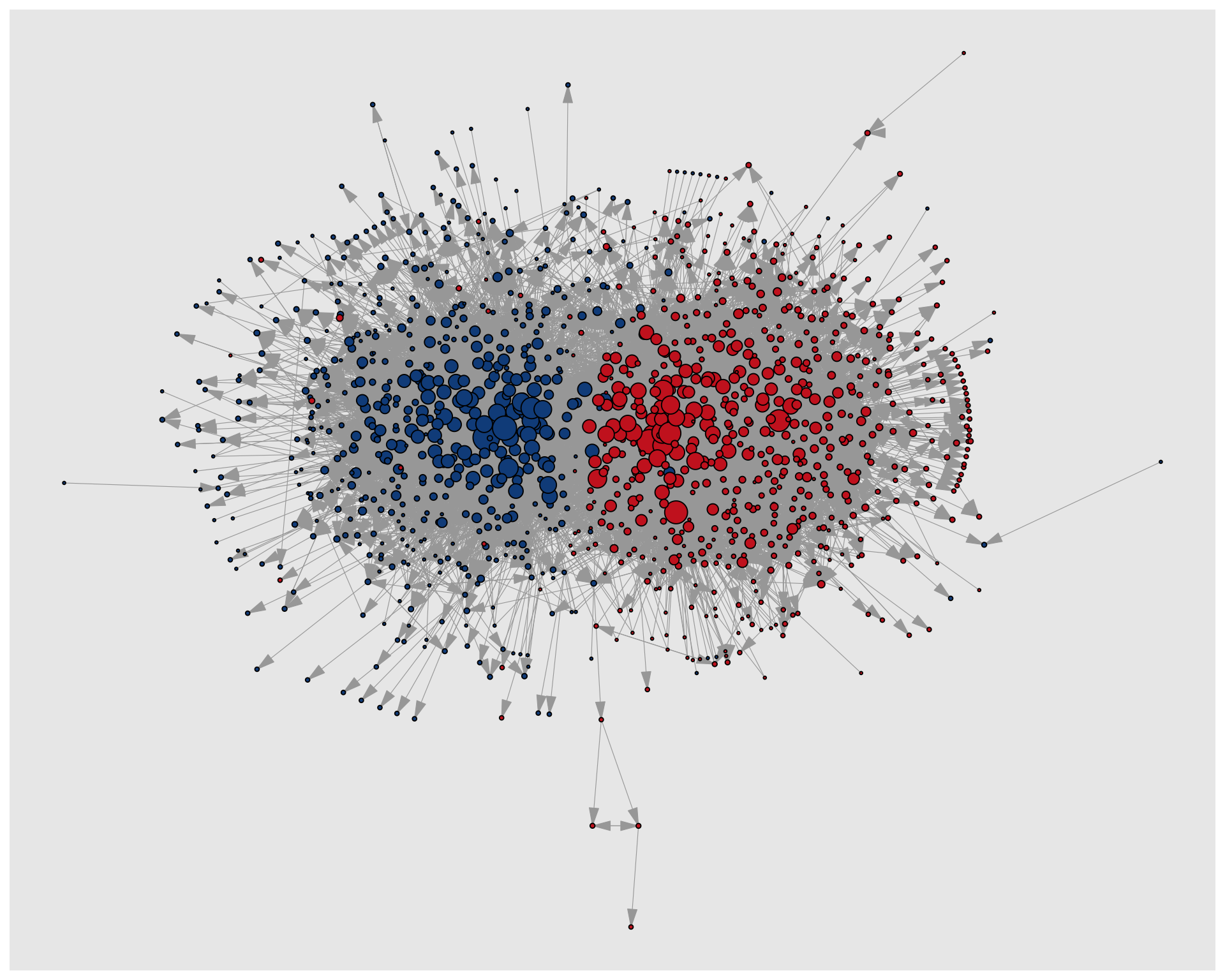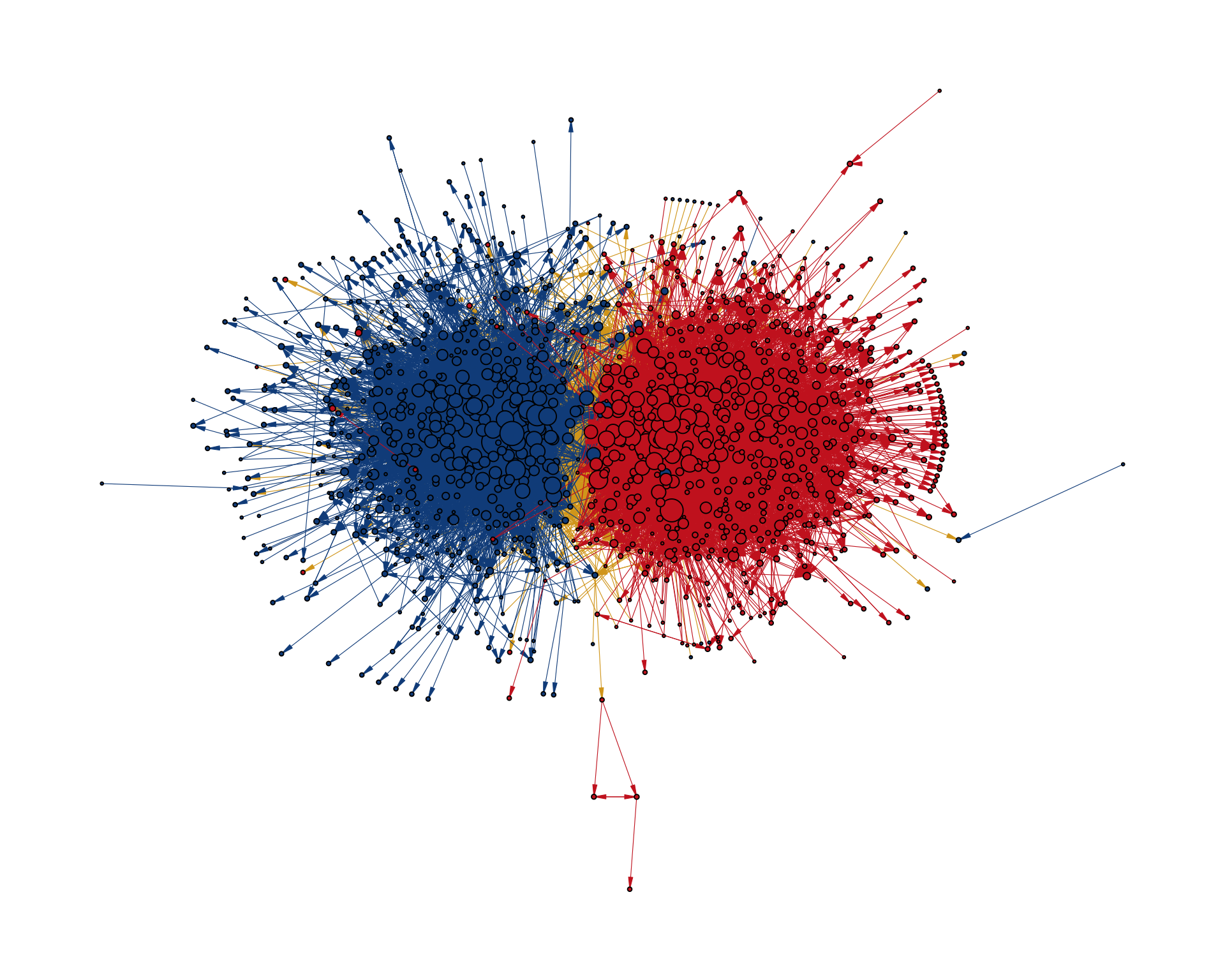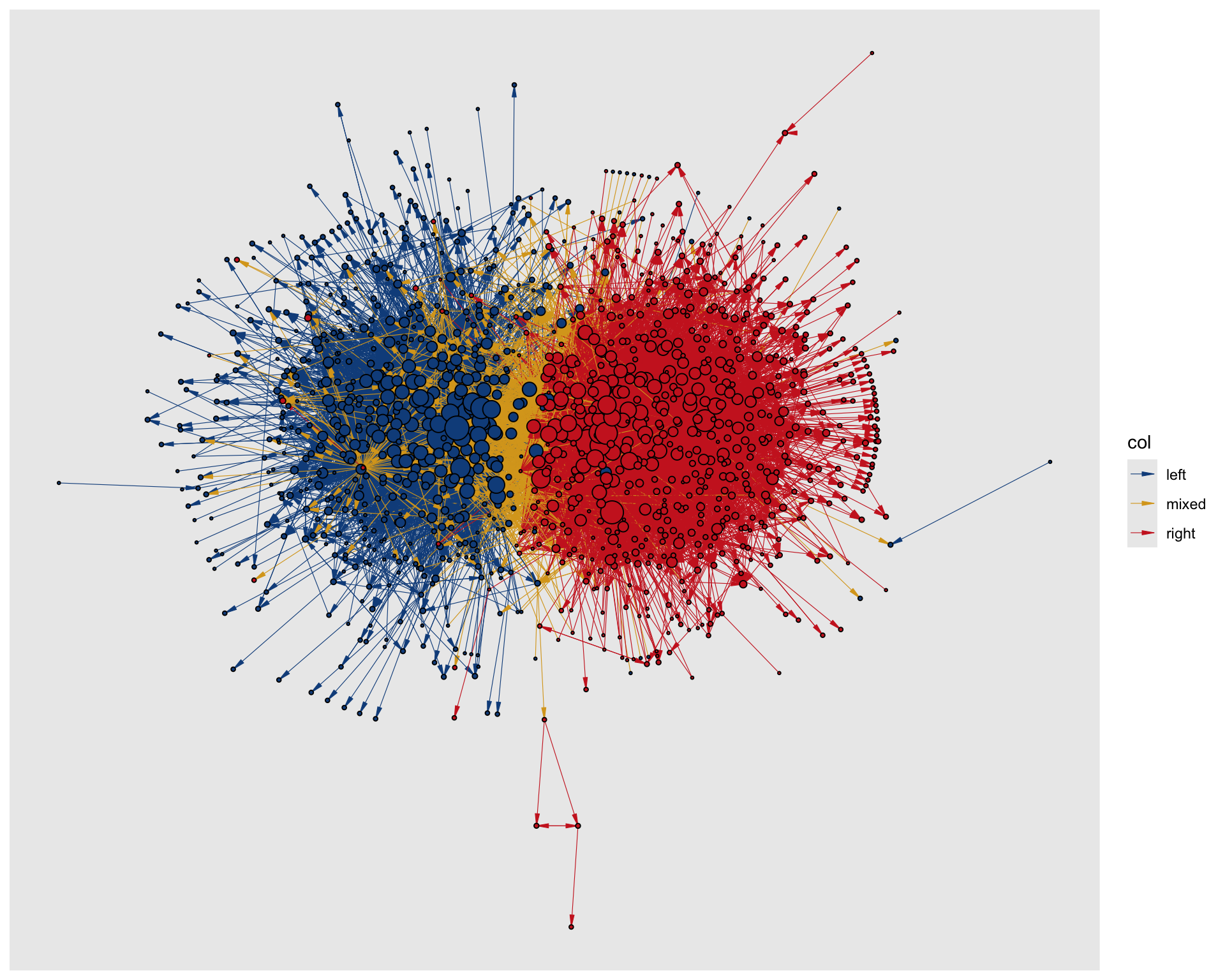 Figure 10.14 shows the network with styling applied to the nodes. Political orientation is mapped to node colour and indegree to node size. The colors are manually set to match the original visualization and the size range is adjusted to make the differences in node size more visible.